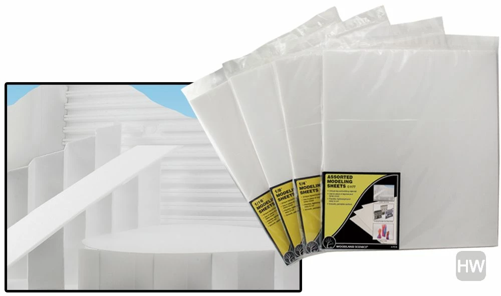 Modeling Sheets are a unique, layout building material made of extruded foam. They are flexible, easy to cut and serve as a lightweight alternative to styrene or balsa wood. The smooth, paintable surface accepts a wide variety of paints.