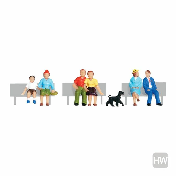 This set includes two men, three women, a child and a dog. A mother and her child wait, perhaps for a bus. A dog sits close by. A woman and man sit, engaged in conversation and another man and woman sit close together, just enjoying each other’s company.