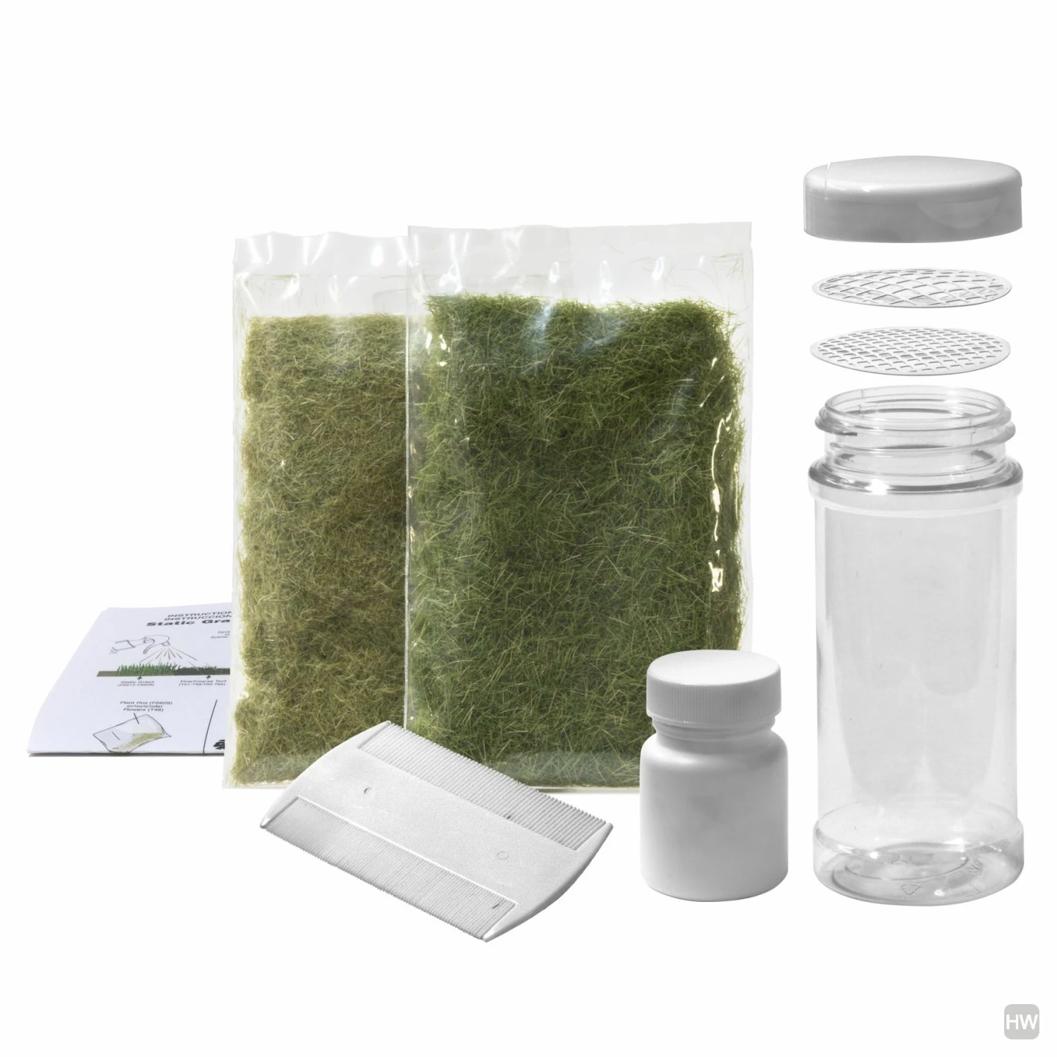 The Static Grass Starter Kit includes everything you need to learn how to use Static Grass. The included Shaker Applicator works well for small projects and the easy-to-follow instructions teach you the basic steps for application. Combine Static Grass with other Woodland Scenics products to enhance your layout.