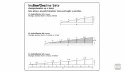 Sets can start an incline at 0″ and reach a maximum height of 4 1/2″ (11.4 cm). Declines can start at a maximum height of 4 1/2″ (11.4 cm) and lower to 0″. Actual measurements depend on the grade used.