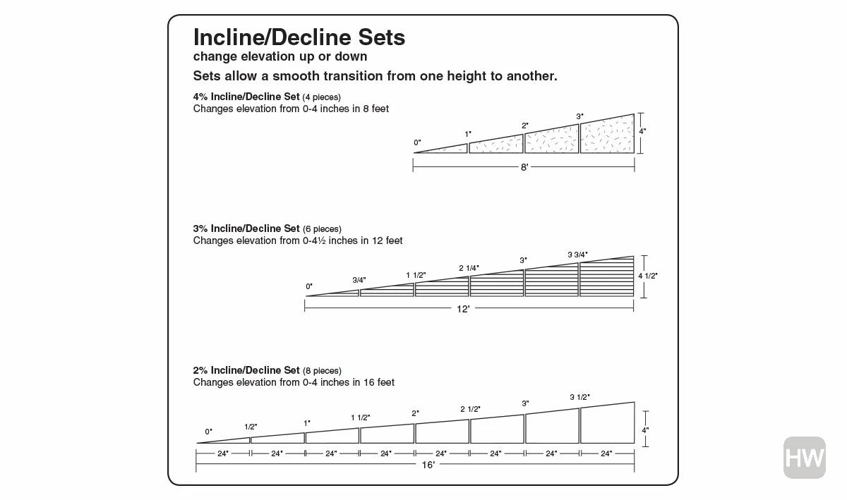 Incline/Decline Sets are the ideal way to alter the elevation of your track quickly and easily. Each set includes the high-density foam pieces necessary to raise or lower the elevation of your track. Incline/Decline Sets come in either 2%, 3% or 4% grades.